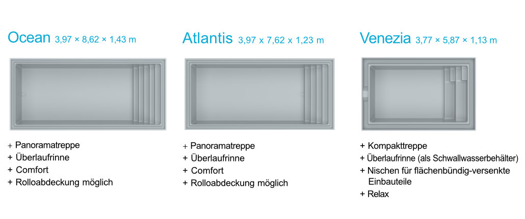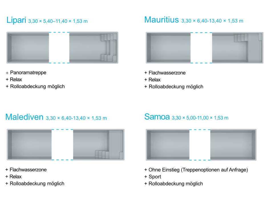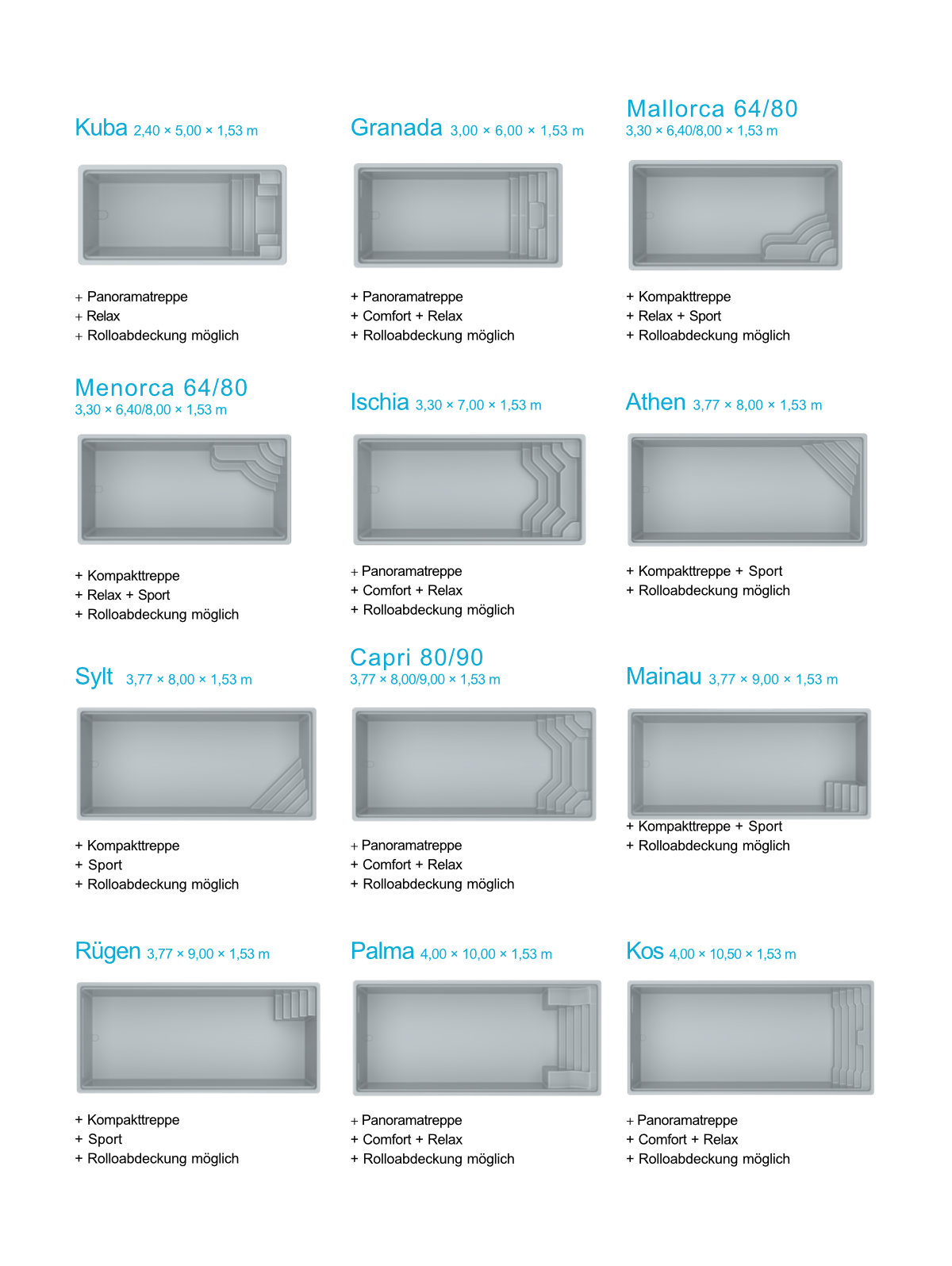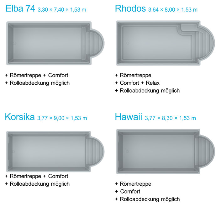 Für jeden Geschmack gibt es das passende Einstückbecken: Es stehen Ihnen 30 Modelle zur Auswahl, die in Länge und Breite variiert werden können und somit in jedem Garten den passenden Platz finden.