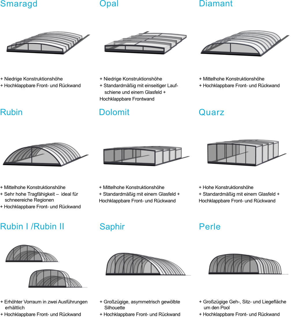 Gehen Sie beim Badespaß in die Verlängerung! Mit einer Überdachung können Sie Ihren Pool unabhängig von der Witterung genießen. Das Wasser bleibt kristallklar, sauber und wohlig warm, die Energiekosten werden deutlich reduziert. Außerdem sind Mensch und Tier in Sicherheit – insbesondere, wenn Sie die Überdachung abschließen. Auf die einfache und komfortable Bedienung wird dabei besonderen Wert gelegt. Es gibt jedoch nicht nur praktische Gründe, die für eine Überdachungen sprechen. Ästhetisch gelungene und technisch ausgereifte Konstruktionen, die mit Ihrem Pool optisch eine perfekte Einheit bilden. Ob extraflach, geschwungen, halbrund oder mit unterschiedlicher Höhe und bequemen Zugang; jedes Modell setzt einen anderen architektonischen Akzent und wertet Ihren Pool auf. Reizvoll fürs Auge heißt immer auch: höchste Qualität. Deshalb setzen wir auf Überdachungen mit langlebigem Aluminium und glasklares, unzerbrechliches Polycarbonat. Es gibt eine Vielzahl an Formen und Ausstattungen.
